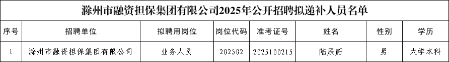 根據(jù)《滁州市融資擔(dān)保集團(tuán)有限公司2025年公開招聘工作人員公告》相關(guān)規(guī)定,經(jīng)報(bào)名、資格審查、筆試、面試、體檢、考察等招聘程序,現(xiàn)將擬遞補(bǔ)人員予以公示。